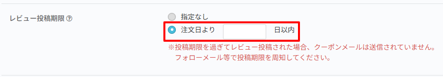 レビュー投稿期限を注文日より○日以内を選択し、ボックスの中に日数を半角数字で入力します。